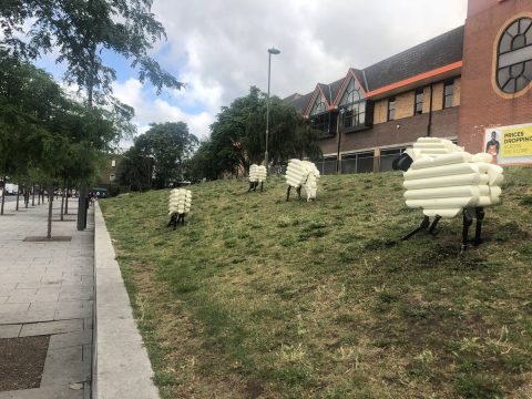 Cricklewood Sculptor, Alistair Lambert‘s vision of rural Cricklewood – sheep sculptures on green space In Cricklewood Lane.